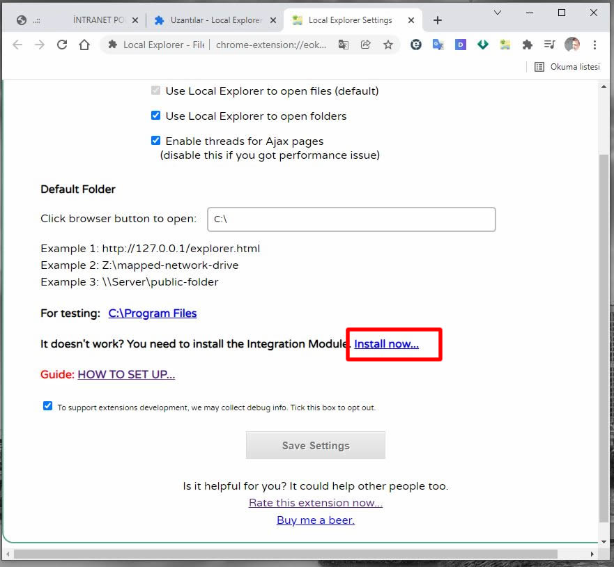Son olarak ise ilk olarak ele aldığımız Edge tarayıcı üzerinde Internet Explorer mode kullanarak lokaldeki intranet sayfamız üzerinde Windows Gezgini açma işini Chrome üzerinden yapacağız. Tekrardan yine Chrome üzerinde intranet sayfamızı açıp linke tıklıyorum. Doğal olarak bir tepki vermiyor.
