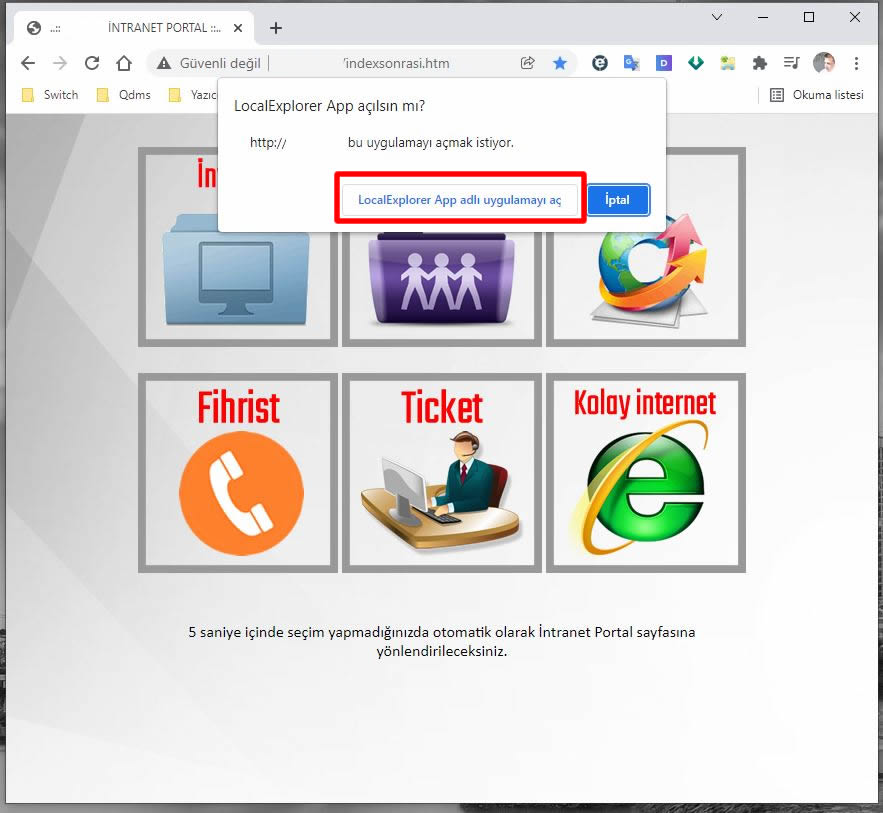Bu işlemden sonra tekrardan linkimizi açmaya çalışalım. Linke tıkladığımızda LokalExplorer App adlı uygulamayı aç pop-up uyarısı gelmekte. Bu butona tıklayalım.