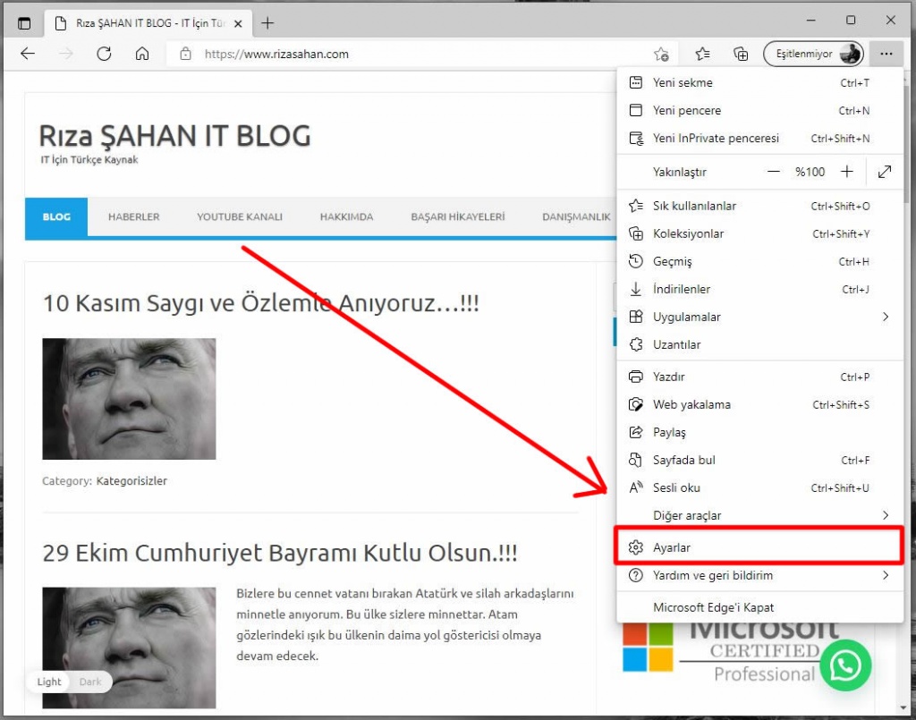 Sayfa tepki vermiyor. Bunu aşmak için bu şekilde sorunlu olan sayfaları tek tek Explorer mode tabanlı olarak izin vermeniz gerekiyor. Şimdi Edge üzerinde Explorer Mode kullanımına bakalım. Edge üzerinde Menüden Ayarlar kısmına girelim.
