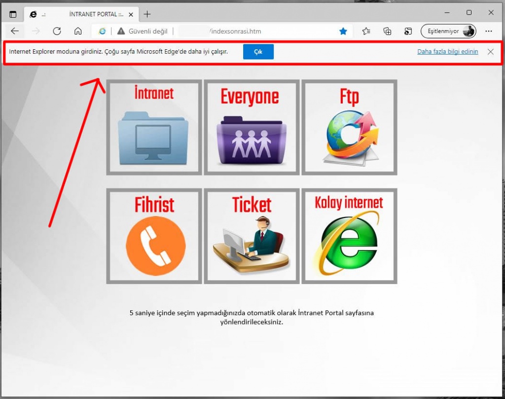 Bu işlemden sonra Internet Explorer ikonu gözükür duruma geldi. Alt kısımda ise sayfayı Explorer ile açtığımıza dair, Edge üzerinde iyi çalışacağını bildiren bir popup geldi. İyi değil hiç çalışmıyor Edge üzerinde 😊