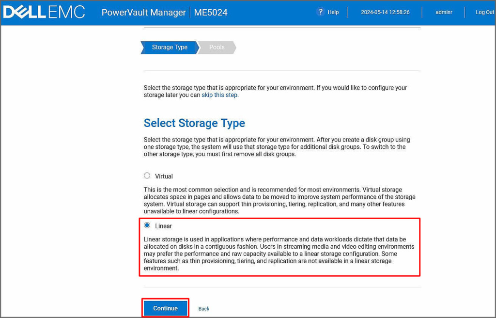 Bu adımda storage yapılandırma türünü seçmemiz istenmektedir. Virtual seçimi sanallaştırma ortamlarında tercih edilerek edilir. Yapılandırma sonrası storage sanallaştırma ortamında kullanıma hazır hale gelir. Biz ilerleyen kısımlarda bu özelliği kapsayan işlemlere yapacağız ancak amacımız basit yapılandırma ekranlarını göstermek olduğu için Linear seçimi ile ilerleyeceğiz. Bu seçim genelde dosya bazlı depolama ve işlemlerin gerçekleştirildiği durumlarda tercih edilir. Continue ile sonraki adıma devam edelim.