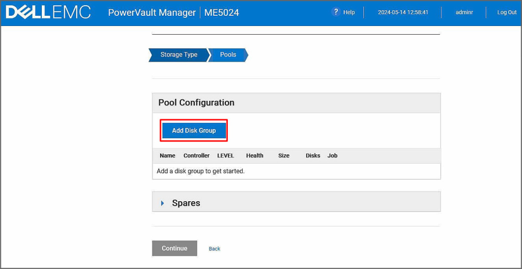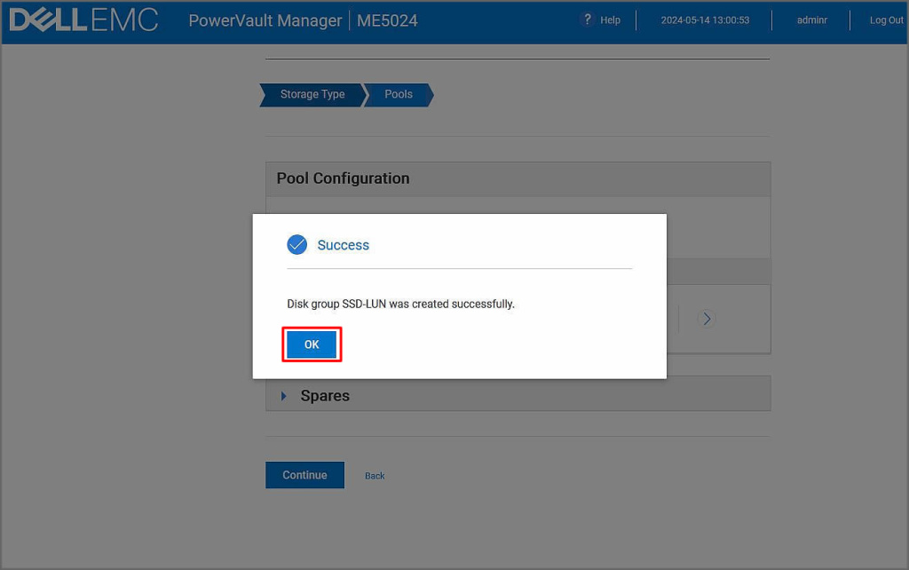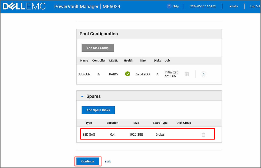 Pool altında Global olarak yapılandırılan spare diskimizi aşağıdaki gibi görmekteyiz. Continue ile sonraki adıma ilerleyelim.
