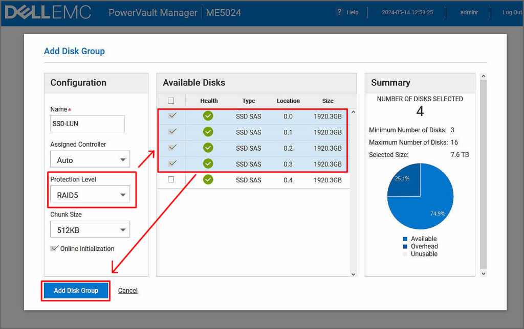 Şimdiki adımımızda bir disk grubu oluşturmamız gerekmekte. Add Disk Group butonuna tıklayalım.