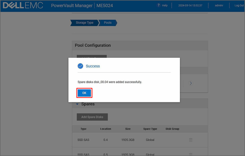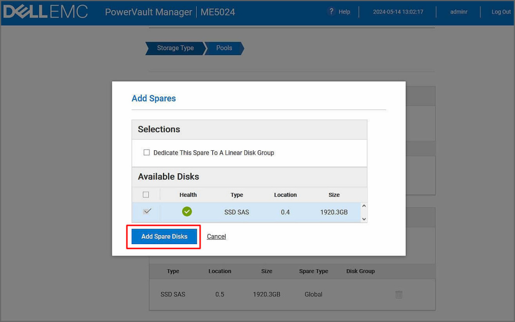 Bu ekranımızda spare olarak eklenebilecek diskler karşımıza geliyor. Zaten bir diskimiz olduğu için bu diski seçerek Add Spare Disks butonuna tıklayalım.