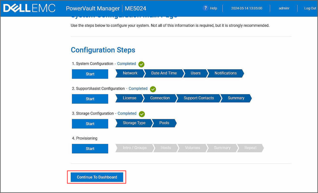 Start ile ön yapılandırma işlemleri tamamlanan disk grubumuz bir hosta atanabilir. Ancak biz şu anda bir host bağlantısı yapmadığımız için bu adımı pas geçiyoruz. Continue To Dashboard butonuna tıklayarak dashboard ekranımıza geçelim.