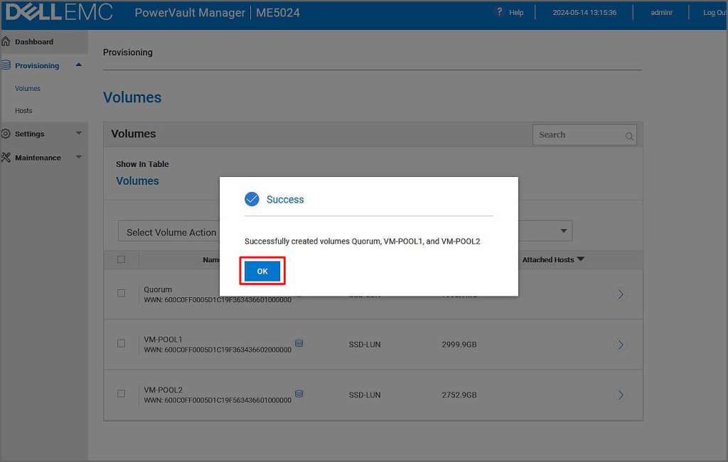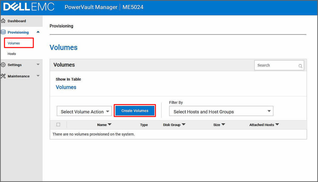 Şimdi oluşturduğumuz pool yani disk havuzu içerisinde volüme oluşturma adımlarına geçelim. Biz ortamımızı Hyper-v cluster alt yapısında çalışacak şekilde volüme tanımlamalarını yapacağız. Bu işlem için Provisioning menüsü altında yer alan Volumes açılır menüsüne tıklayalım. Açılan ekranda Create Volume butonuna tıklayalım.