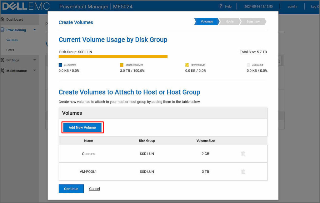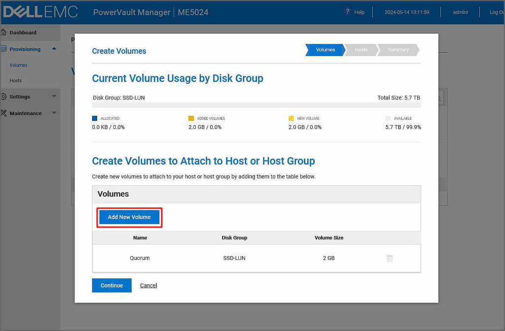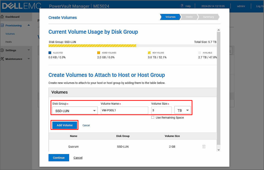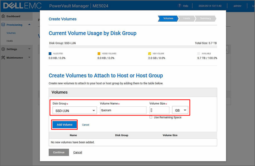 Açılan ekranımızda Disk Group seçimini yapalım. Bir tane disk grubumuz olduğu için SSD-LUN isimli grubumuzu seçelim. ismini kapasitesini belirledikten sonra Add Volume butonuna tıklayalım.