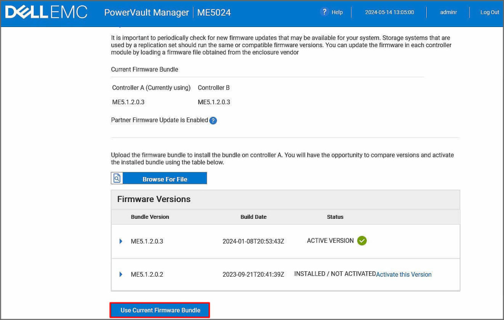 Bu ekranımızda cihaz içerisindeki aktif imaj ve bir önceli firmware imaj versiyonu görünmektedir. Biz şu anda aktif olarak da kullanılan imaj seçiliyken Use Current Firmware Bundle butonuna tıklayarak sonraki adıma ilerleyelim.