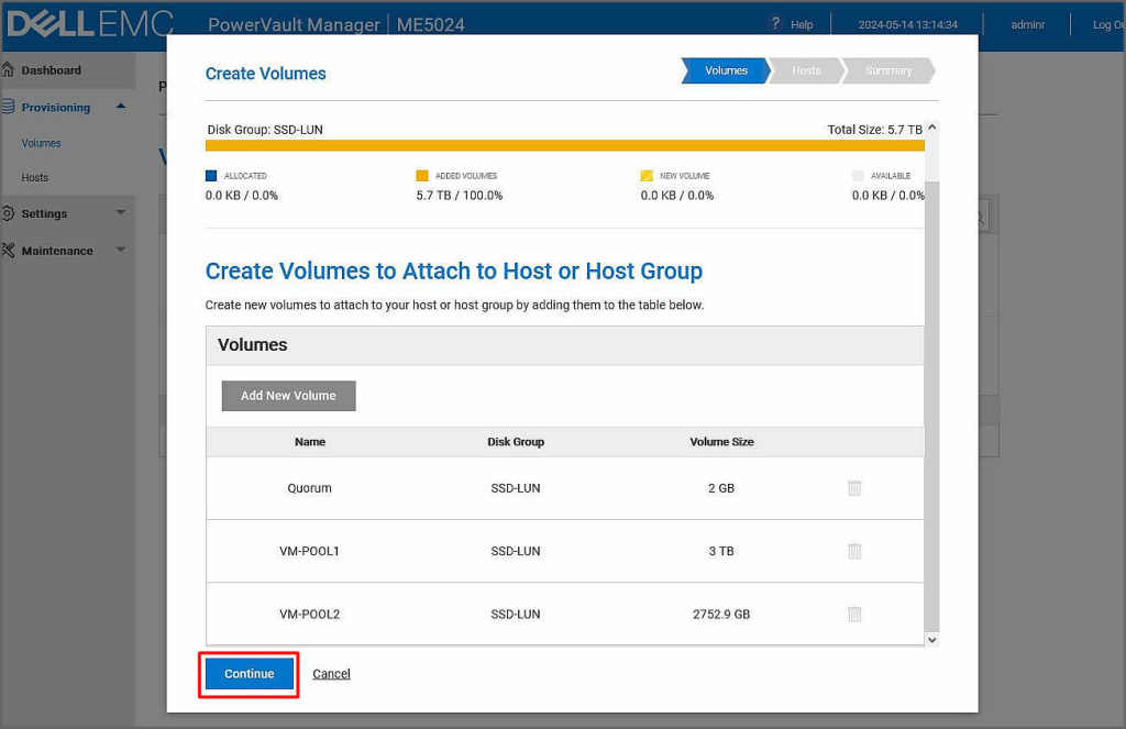 Oluşturulan volüme alanlarının bir hosta bağlanması noktasında Continue ile ilerleyelim.