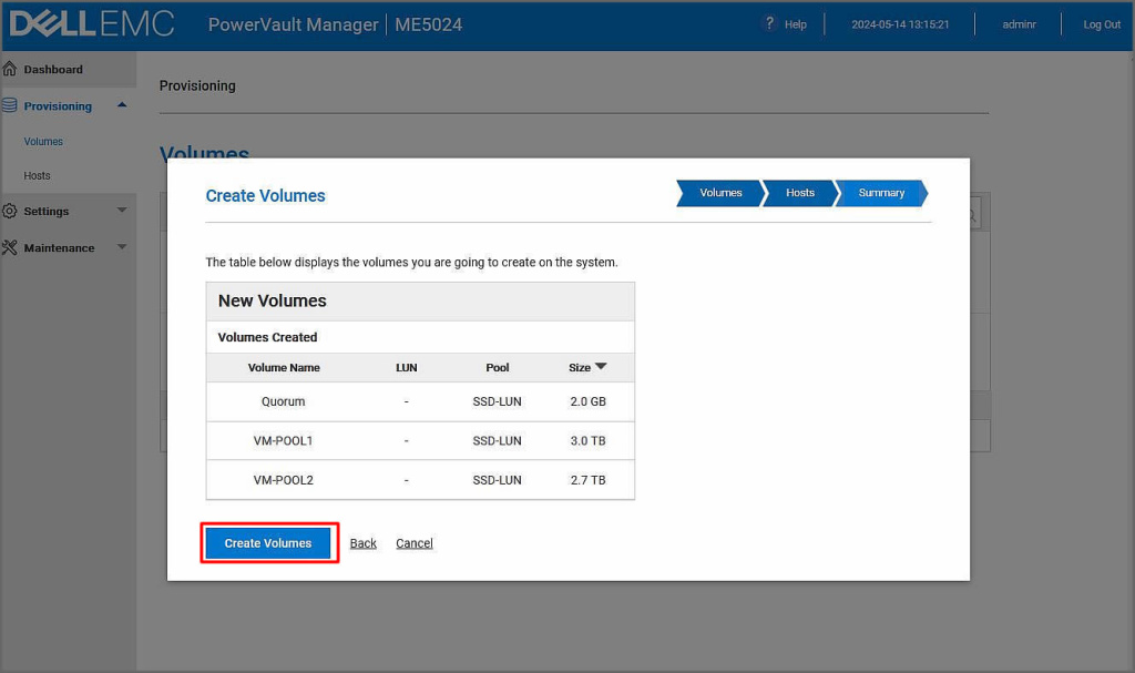 Oluşturulan volüme adımlarının tamamlanması için Create Volumes butonuna tıklayalım.
