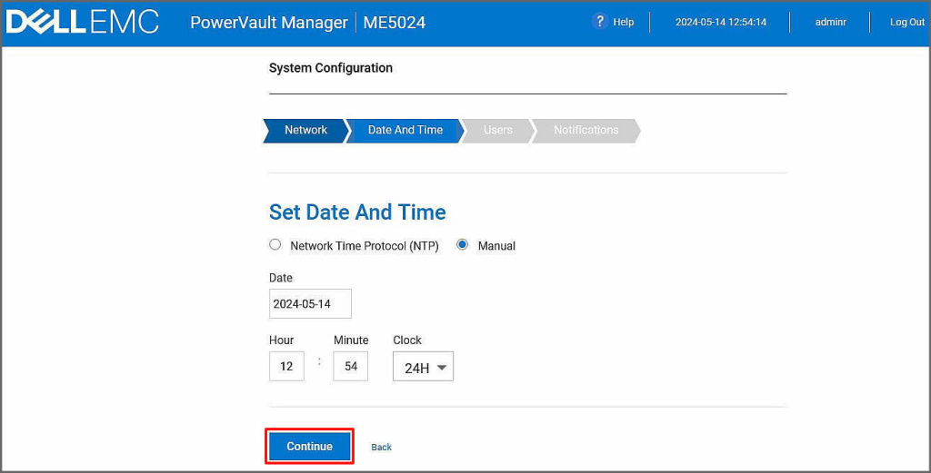 Bu ekranımızda cihazımızın tarih saat ayarını yapabiliriz. Ortamınızda bir NTP sunucu varsa veya cihaz internete erişim sağlıyor ise bir NTP sunucusuna bağlayabilirsiniz. Biz mevcut durumda tarih ve saat ayarını ülkemize göre yaparak manuel zamanlama ile sonraki ekrana Continue butonuna tıklayarak ilerliyoruz.