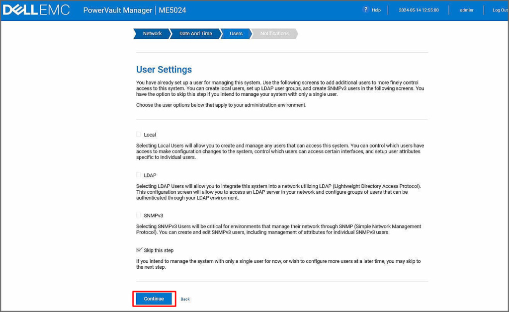 Bu ekranımızda cihazımızdaki kullanıcı tanımlamalarını LDAP ile yapabiliriz. Biz cihazı ilk açtığımızda kullanıcı tanımladığımız ve lokal kullanıcı ile ilerleyeceğimiz için Continue butonuna tıklayarak sonraki adıma ilerliyoruz.