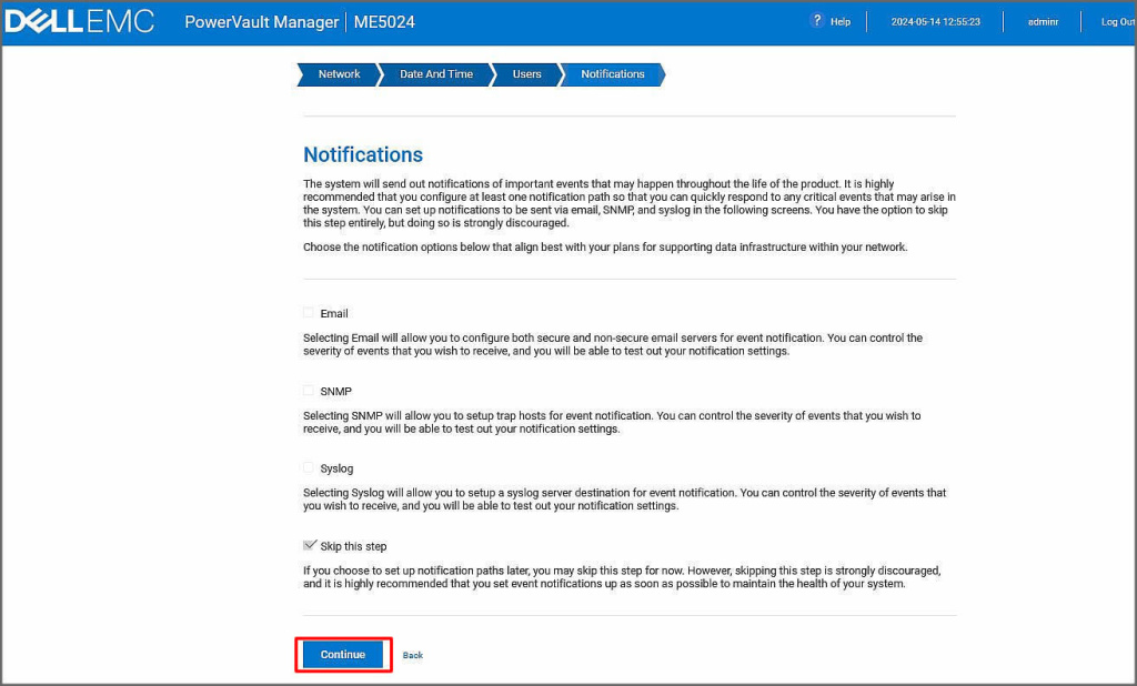 Bu ekranımızda bildirimler almak için mail, snmp, syslog gibi protokollerin ayarlarını yapabiliriz. Biz bu ayarları temel yapılandırma sonrası yapacağımız için şimdilik Continue butonuna tıklayarak ilerliyoruz.